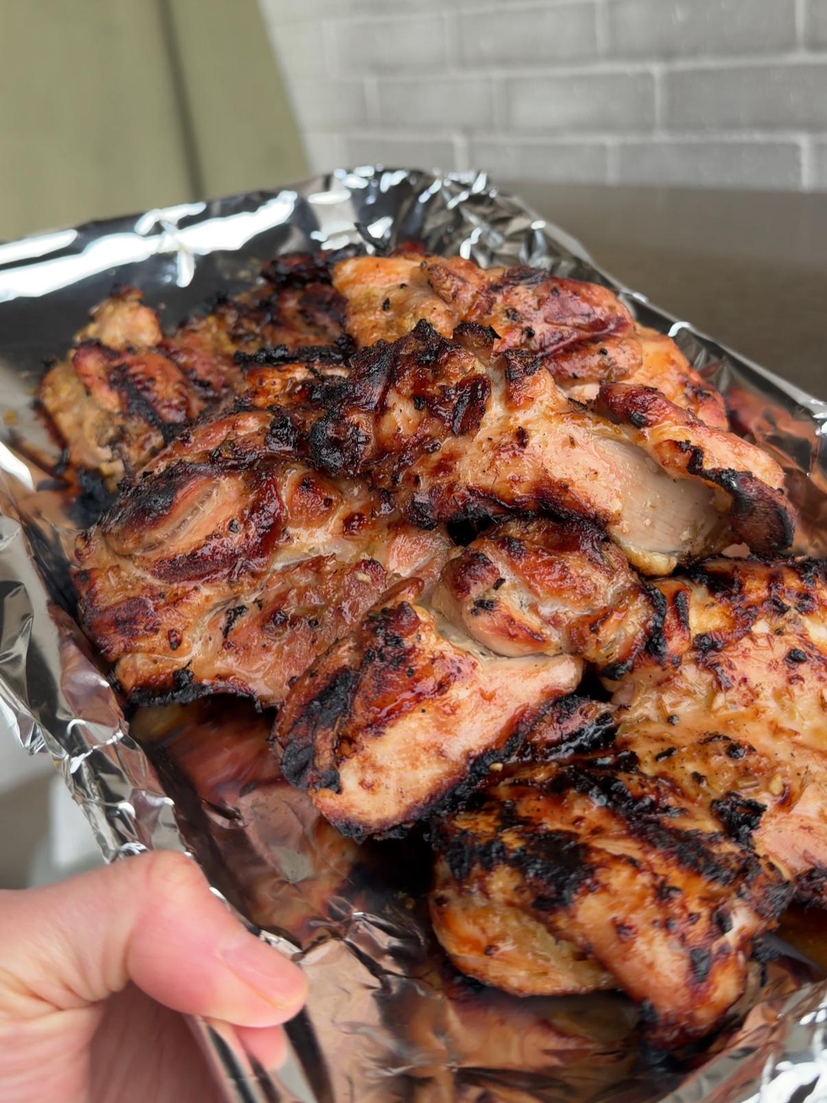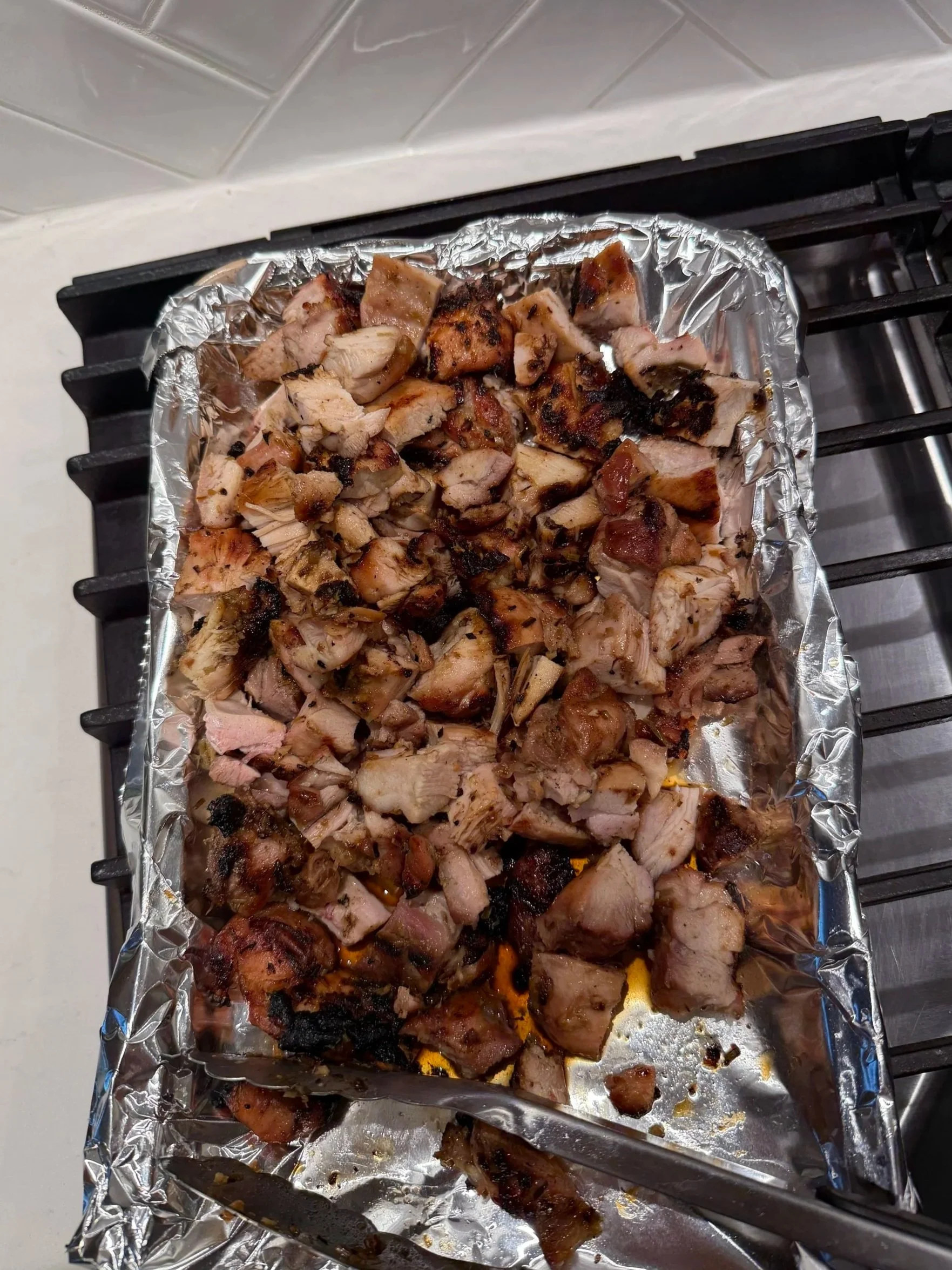 Grill chicken for 6-8 minutes on each side until nice and charred. Chop into cubes for easy eating. Alternatively, you can broil in the oven until cooked for a similar effect.